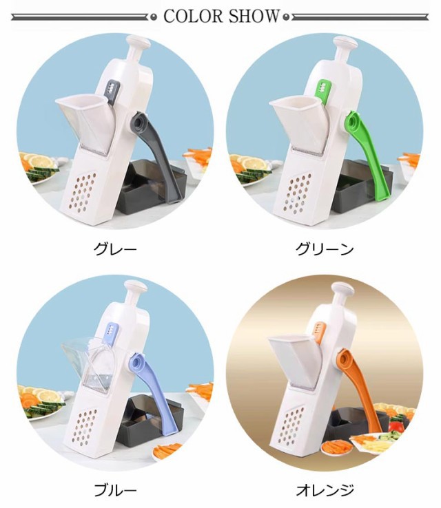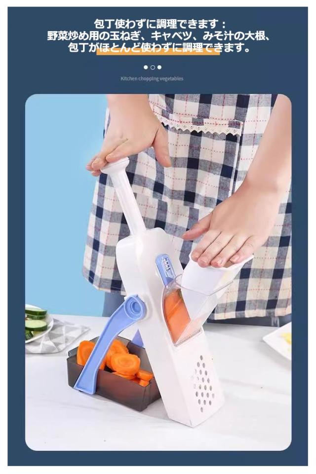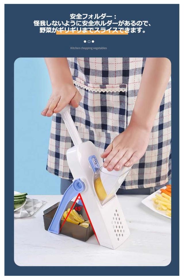 | 軽い力でプロのような千切りができます。 野菜が小さくなってもホルダーがついているので、安心して調理できます。 包丁使わずに調理できます:野菜炒め用の玉ねぎ、キャベツ、みそ汁の大根、包丁がほとんど使わずに調理できます。 綺麗にカット:人参を千切りに力をそれほど使わずに綺麗にカットすることができます。 安全フォルダー:怪我しないように安全ホルダーがあるので、野菜がギリギリまでスライスできます。 | |