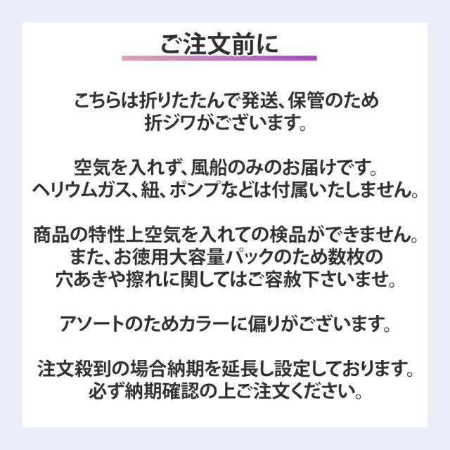 お届けするのは、空気を入れていない風船本体のみです。ヘリウムガスや空気入れ、紐などの付属品は含まれていません。発送時には折りたたんだ状態で袋詰めするため、折ジワが見られる場合がありますが、ふくらませると目立ちにくくなります。大容量パックという性質上、まれに穴あきや表面のこすれなどが含まれることがあります。その際は、予備として多めに入っている風船をお使いください。事前に全数をふくらませて検品することはできないため、あらかじめご了承ください。