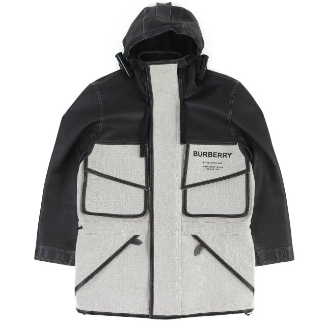極美品△BURBERRY バーバリー 4567182 ホースフェリー レザー×コットンキャンバス WZIP フーデッド ジャケット コート 黒 46 正規品