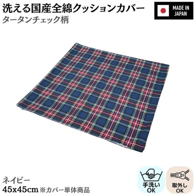 洗える国産全綿クッションカバー タータンチェック ネイビー 綿100% 日本製 ファスナー付き