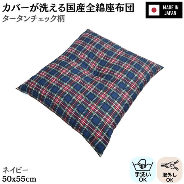 カバーが洗える国産全綿座布団 タータンチェック ネイビー 綿100% 日本製 国産わた入れ加工 ファスナー付き