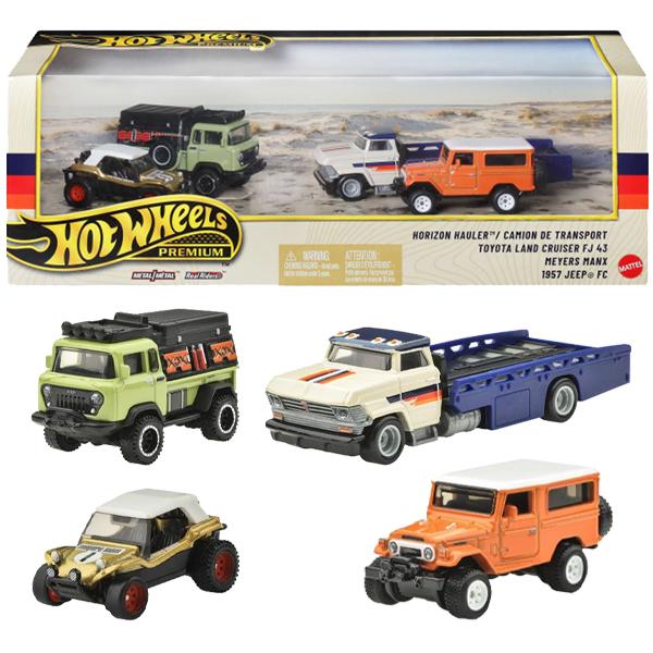 ジープ型の高機動車「トヨタ ランドクルーザー FJ 43」、フォルクスワーゲン タイプ1(ビートル)のシャシーだけを取り出し、前後車軸間隔を詰めて樹脂製のオープンボディを架装した「メイヤーズ マンクス」、ウィリス車の高機動車、ジープのシャシーにトラックの車体を架装した「1957 ジープFC」、車体運搬車の「ホライゾンハウラー」4台がセットになっています。