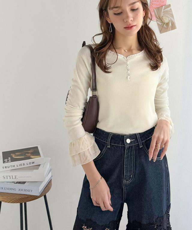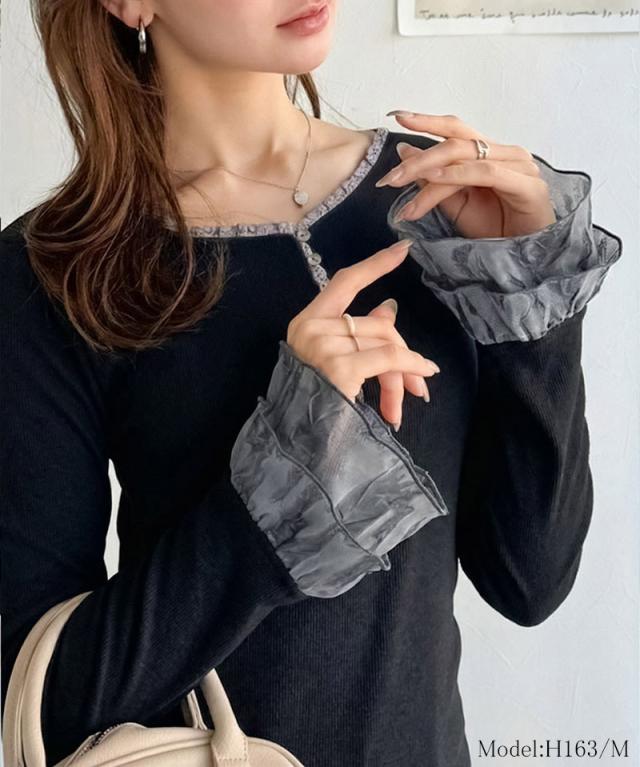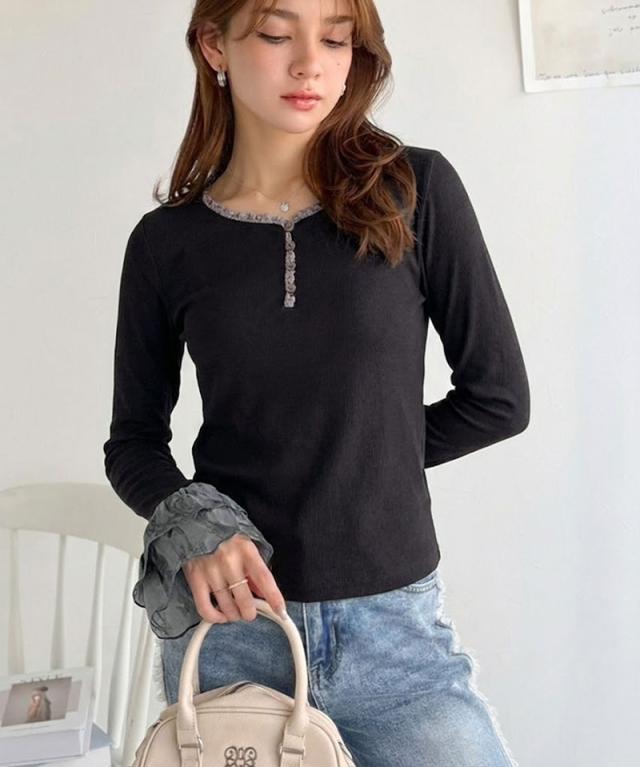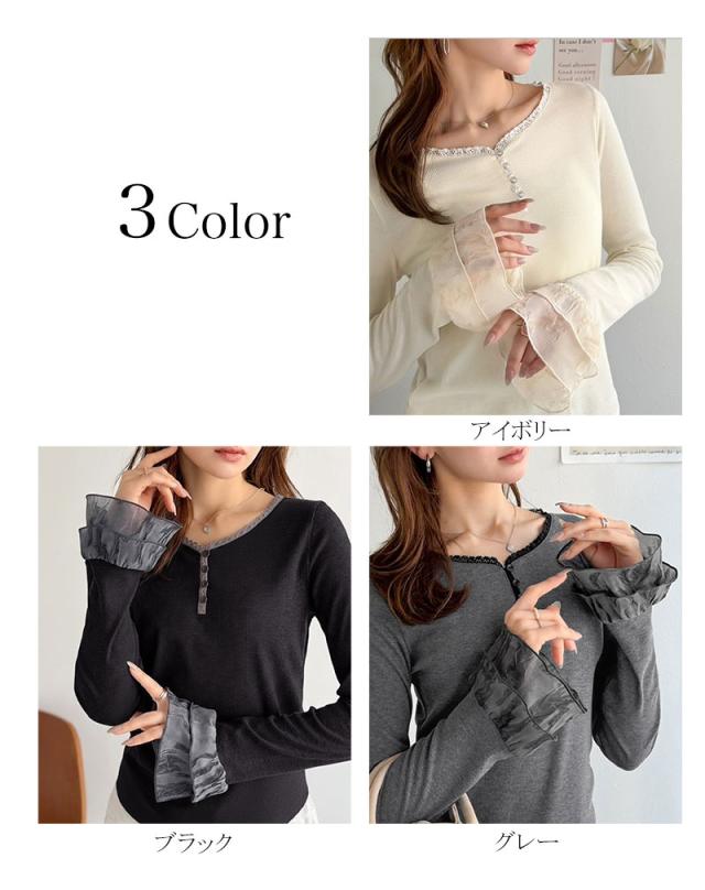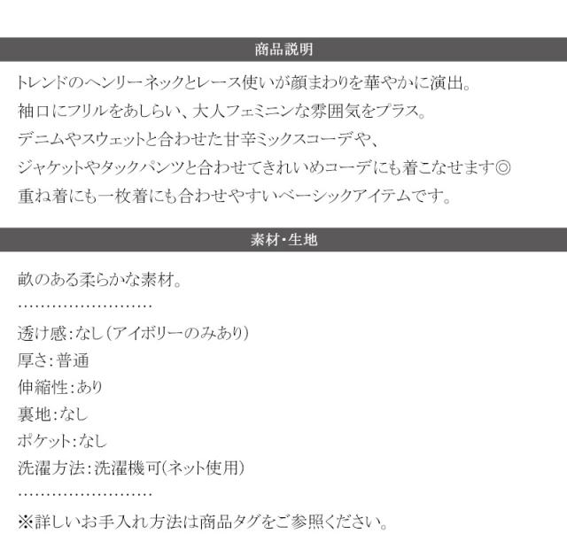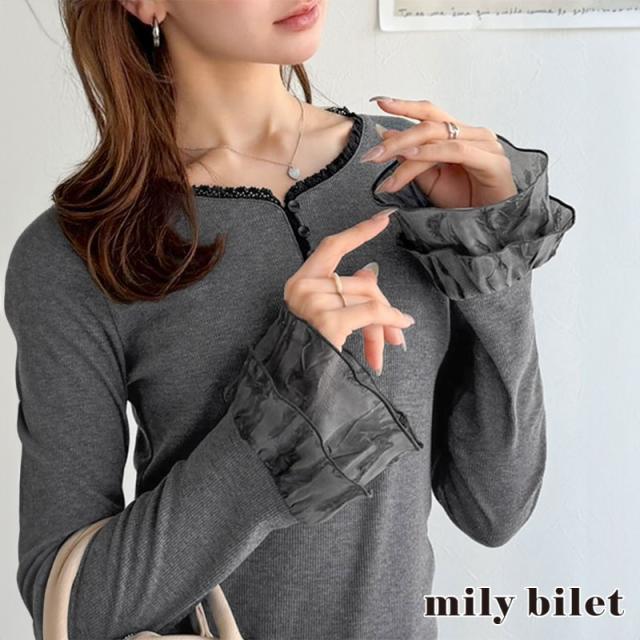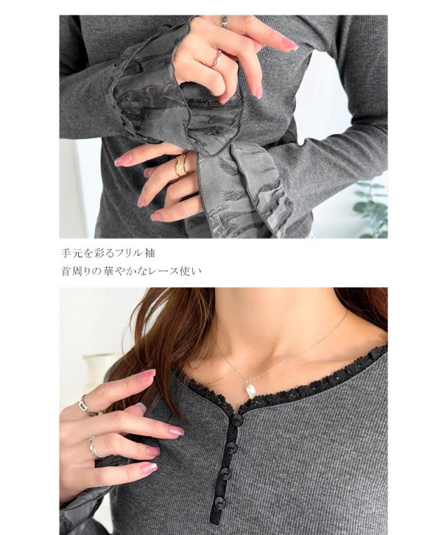 クラシカルエルフ春新作 mily bilet トップス カットソー 長袖 レディース きれいめ 袖フリル レース ヘンリーネック 大人フェミニン エンボス加工 上品 重ね着 映える 華やか フリル袖 きれいめ ベーシック インナー 大きいサイズ 黒 白 2026ss mi1359050