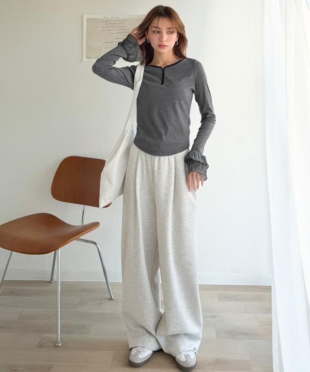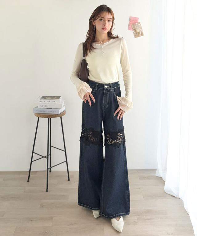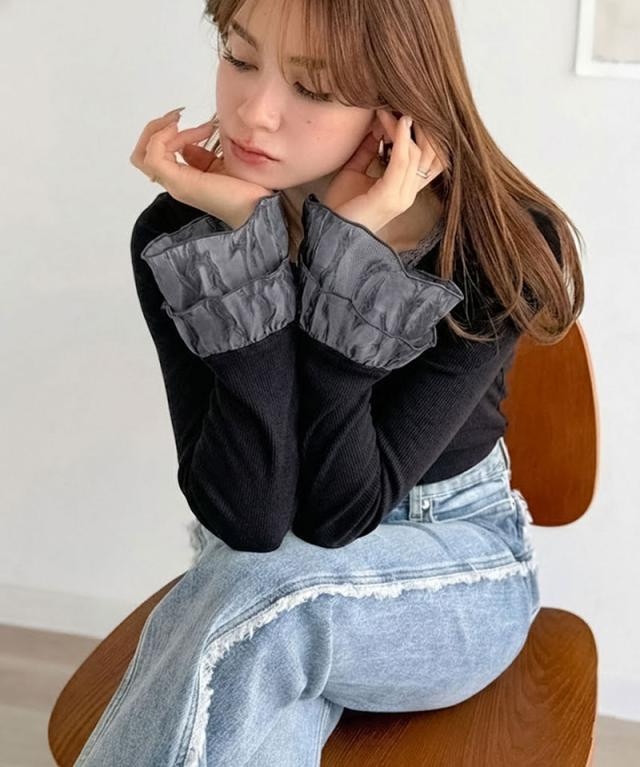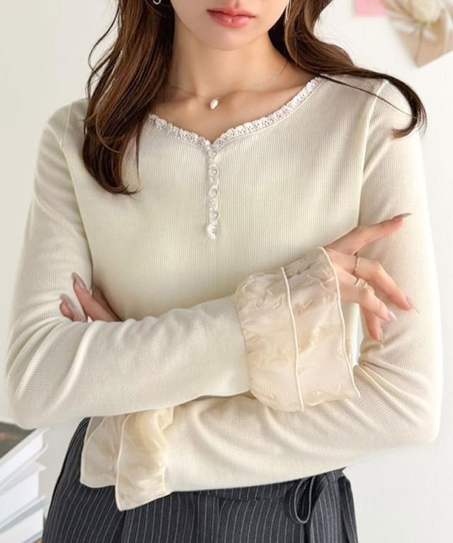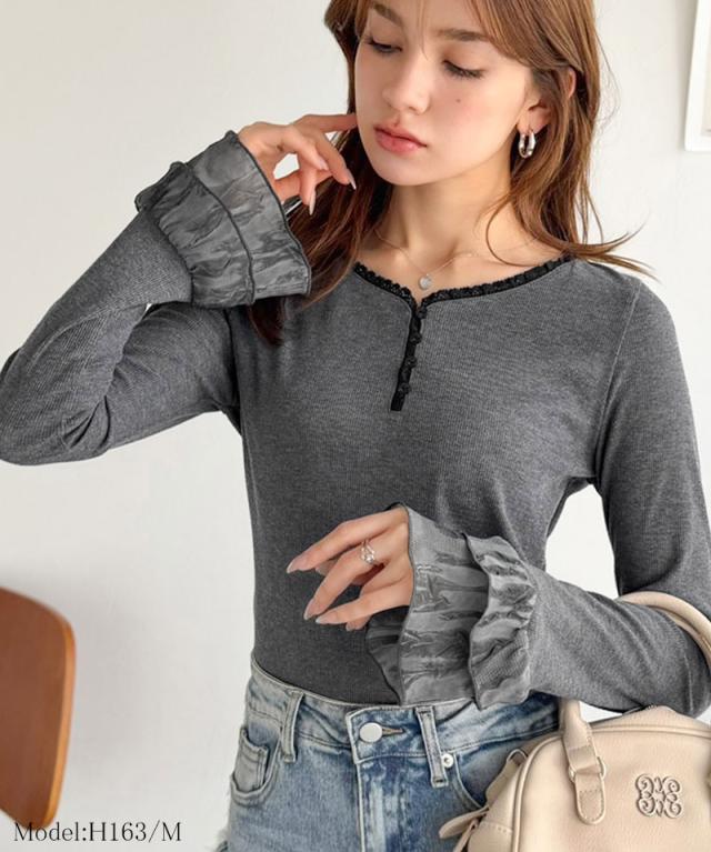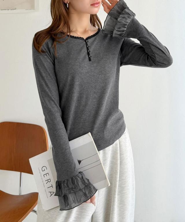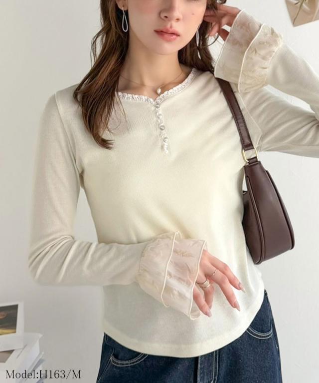 クラシカルエルフ春新作 mily bilet トップス カットソー 長袖 レディース きれいめ 袖フリル レース ヘンリーネック 大人フェミニン エンボス加工 上品 重ね着 映える 華やか フリル袖 きれいめ ベーシック インナー 大きいサイズ 黒 白 2026ss mi1359050