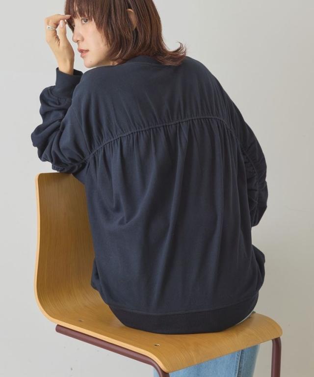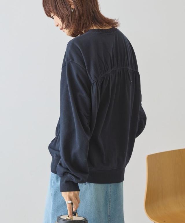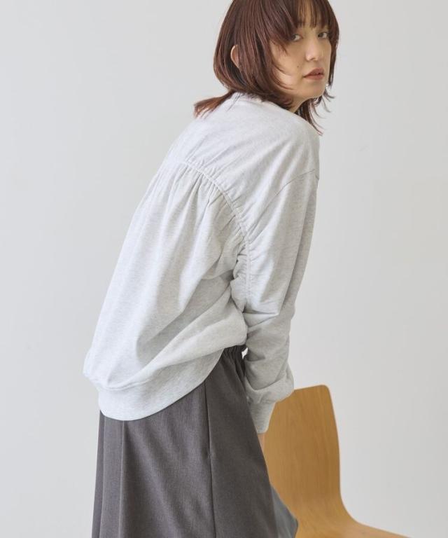 デイリーからお家でのリラックスシーンまで幅広く活躍するスウェットプルオーバー。フロントはシンプルながら、背中から腕にかけて施したギャザーラインが後ろ姿を女性らしくお洒落に演出します。スラックスやスカートなど合わせるボトムを選ばず、着回し力も抜群。一枚着はもちろん、シャツなどを覗かせたレイヤードスタイルもおすすめです。透け感[なし]