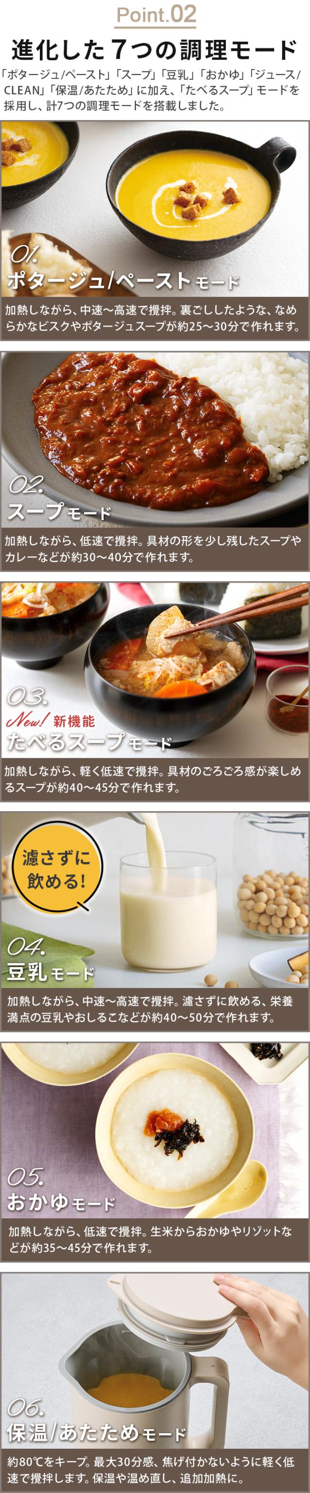 | ポタージュ/ペースト、スープ、たべるスープ、おかゆ、豆乳、保温/あたためモード使用時:50分 ジュース/CLEANモード使用時:3分30秒 |