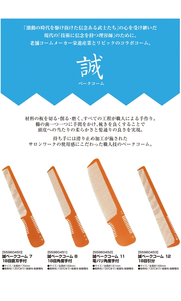 持ち手には滑り止め加工を施されたサロンワークの使用感にこだわった職人技のベークコームです。