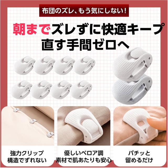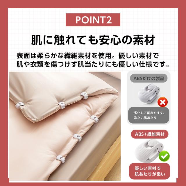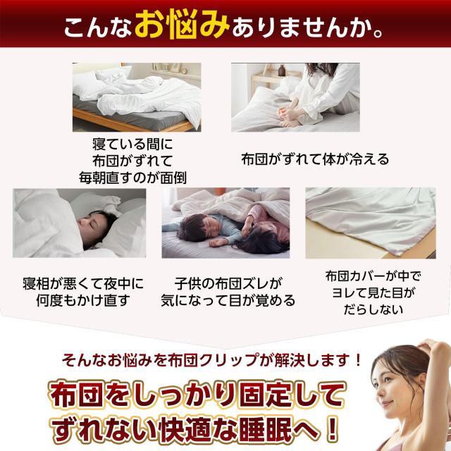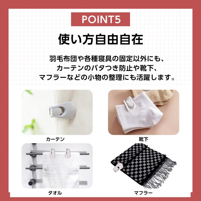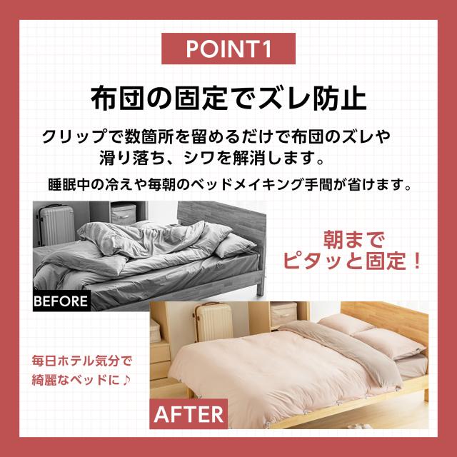 クリップで固定することで、掛け布団と掛け布団カバーのズレを防止したり、ベットから布団が落下するのを防ぎます。