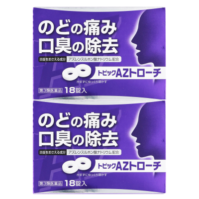 トピックAZトローチは、抗炎症剤 アズレンスルホン酸ナトリウム・グリチルリチン酸二カリウムと殺菌剤 セチルピリジニウム塩化物水和物を配合したトローチ剤です。 のどの炎症による次の症状:声がれ・のどのあれ・のどの不快感・のどの痛み・のどのはれの改善、口腔内の殺菌・消毒、口臭の除去に効果がみられます。