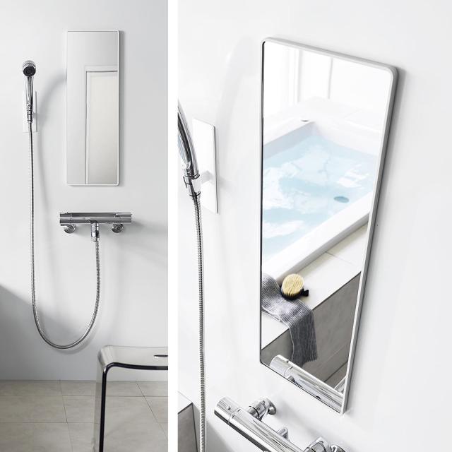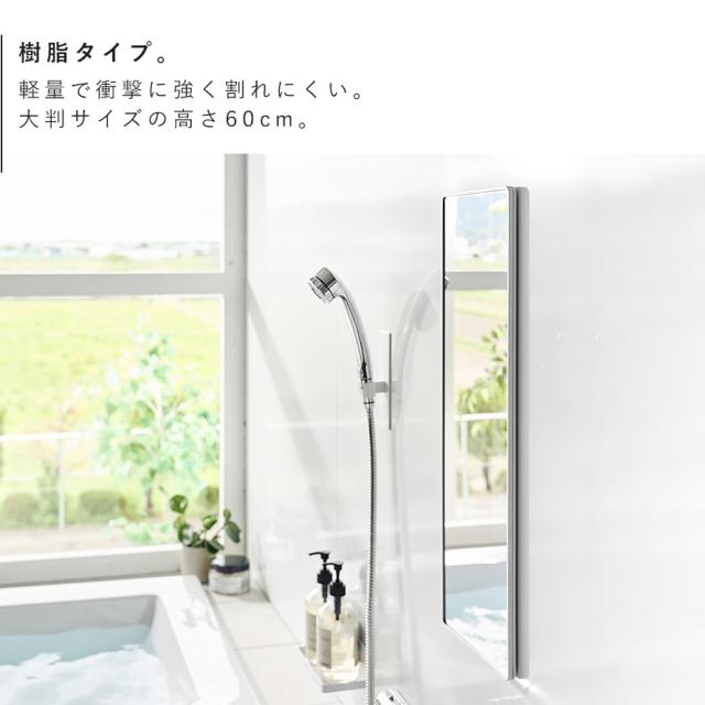 曇り止め加工を施した厚さ6mmの樹脂製バスルームミラーで、ゆがみにくく衝撃にも強い仕様。
