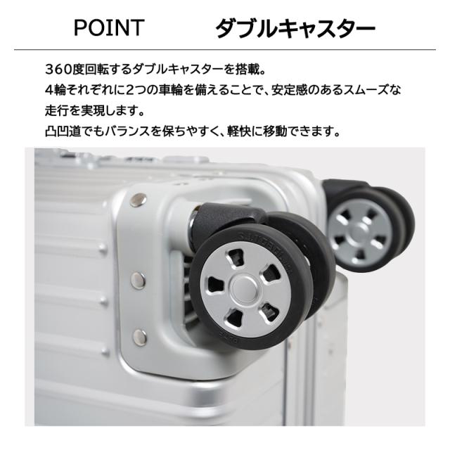 スムーズに走行できるダブルキャスターとダイヤル式TSロック、荷物を整頓しやすい2枚仕切りの内装を備え、旅行や出張など幅広いシーンで活躍します。