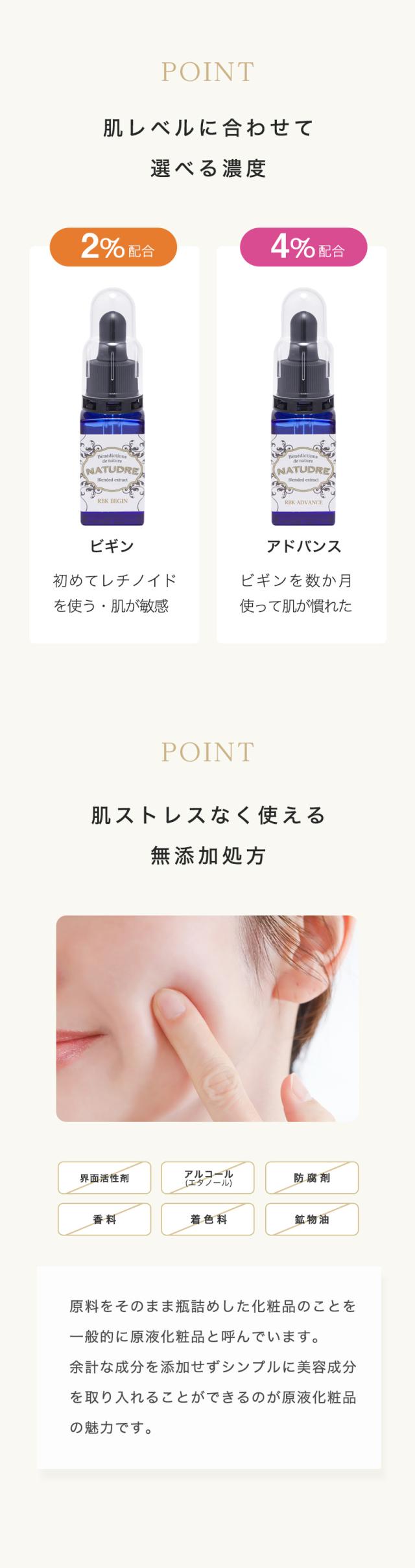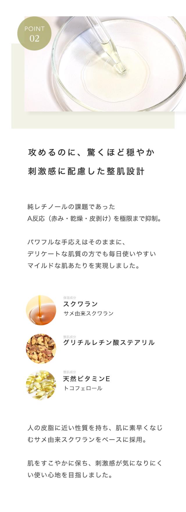 本商品は純レチノールそのものではなく、次世代レチノイドを使用しています。純レチノールに比べマイルドな設計ですが、肌質や体調により感じ方には個人差があります。初めての方は低濃度タイプ(ビギン)からのご使用をおすすめします。