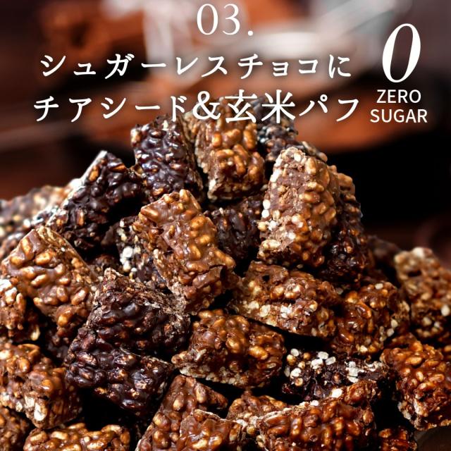 チアチョコ:玄米パフ、マルチトール、植物油脂、全粉乳、カカオマス、ココアパウダー、チアシード/乳化剤、香料、(一部に乳成分・大豆含む)