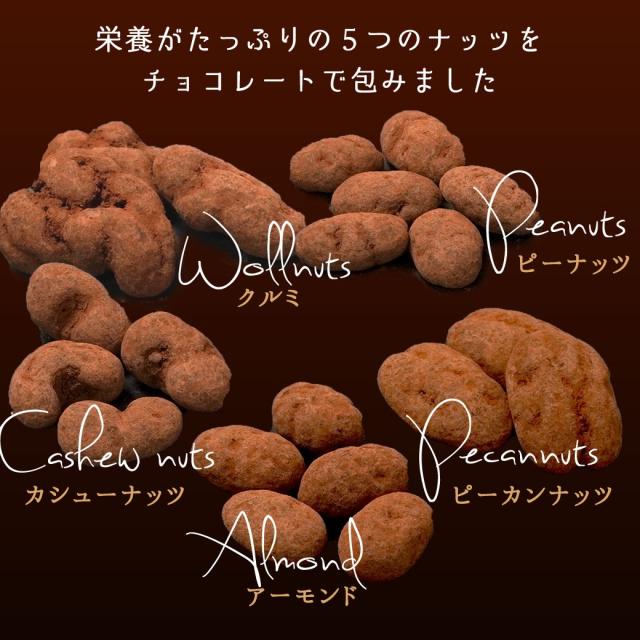 ナッツチョコミックス:準チョコレート(マルチトール、植物油脂、ココアパウダー、カカオマス)(乳成分を含む)(国内製造)、アーモンド、カシューナッツ、クルミ、バターピー(落花生、植物油脂、食塩)、ピーカンナッツ、ココアパウダー/乳化剤(大豆由来)、香料