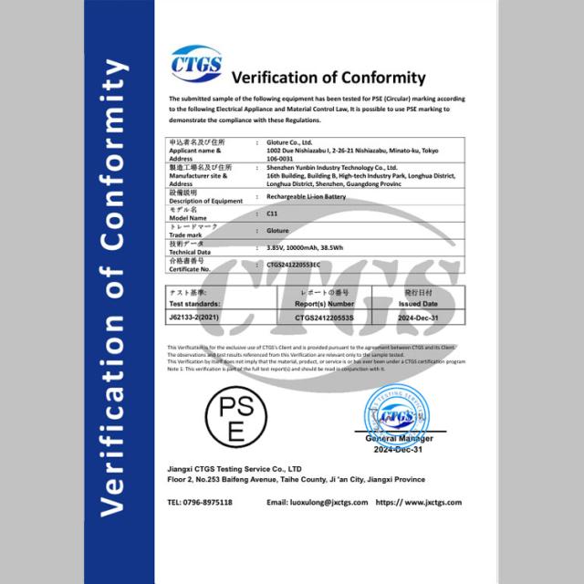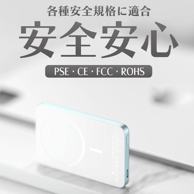 | 本製品は、日本のPSE認証をはじめ、CE・FCCなどの国際安全基準にも適合。過充電・過放電・過電流・短絡保護・温度管理などの安全機能を備え、安心してお使いいただけます。 |