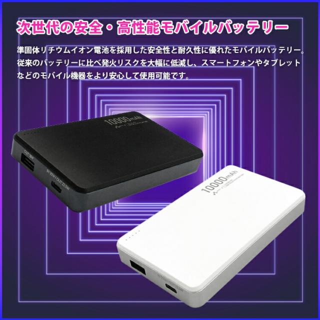 | 準固体リチウムイオン電池を採用した安全性と耐久性に優れたモバイルバッテリー。 従来のバッテリーに比べ発火リスクを大幅に低減し、スマートフォンやタブレットなどのモバイル機器をより安心して使用可能です。 コンパクト設計で持ち運びにも便利。 |