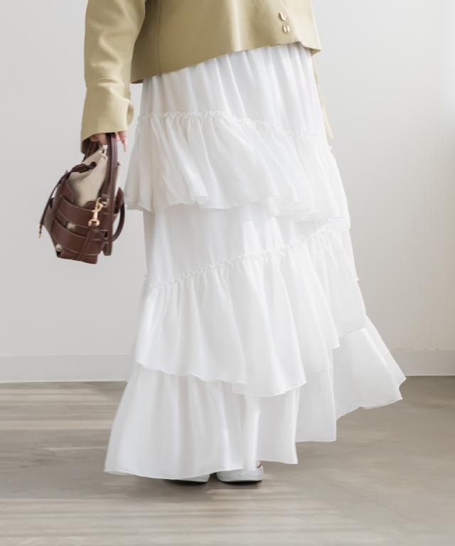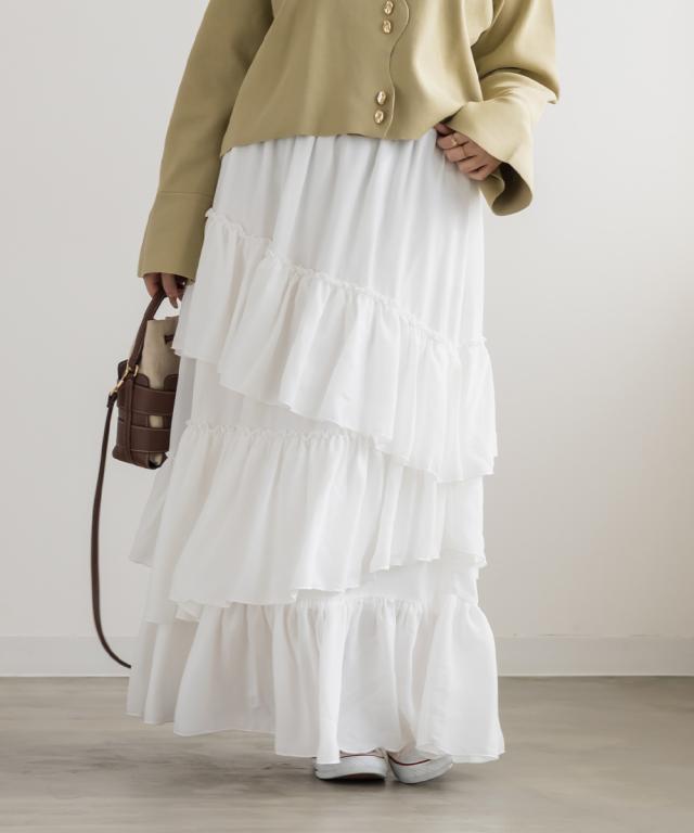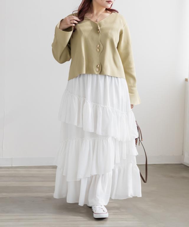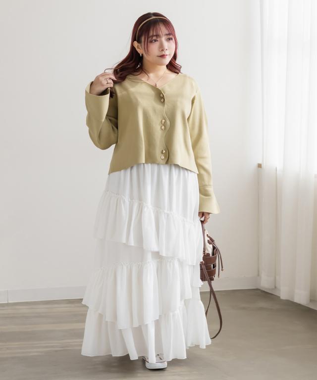 | 3Lを着てちょうどいいサイズでした。ウエストは全部ゴムになっていて着心地らくちんで、アシンメトリーに重ねた生地の揺れ感が華やかさを演出するティアードスカートです!しっかり落ち感があるのでシルエットも広がりすぎずお洒落な雰囲気です◎フェミニン・ガーリー系のトップスとのコーデはもちろん、ジャケットやシャツと合わせてフレッピー系にもピッタリです♪あえてTシャツやスニーカーを合わせたカジュアルな着こなしもおすすめです! |