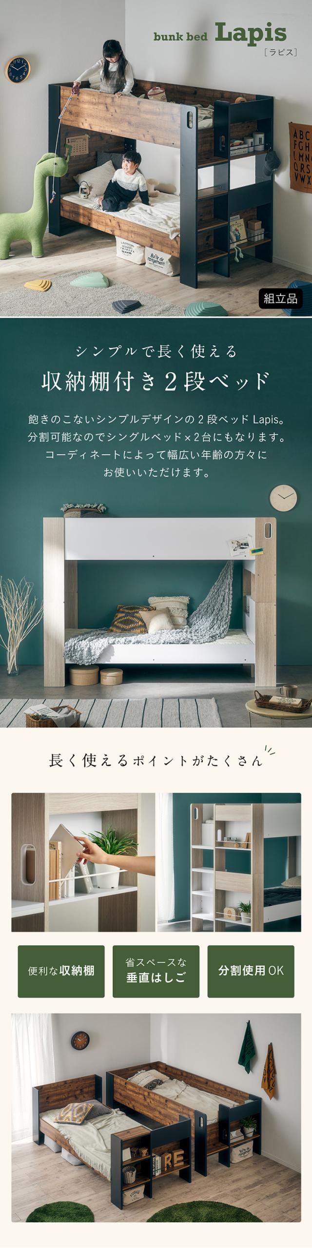 二段ベッド 大人用 マットレス付き 子供 分離 シングルベッド すのこ マットレス シングル 黒 ブラック 2枚セット Lapis(ラピス)+Unity(ユニティ) 2色対応 二段ベット 収納 宮付き おしゃれ 子供部屋