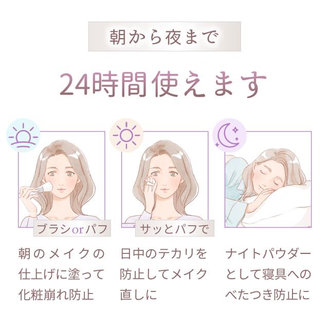 日差しを優しくガードし、肌への負担が少ないため、日中はもちろんナイトパウダーとしても24時間、いつでも使用可能。
