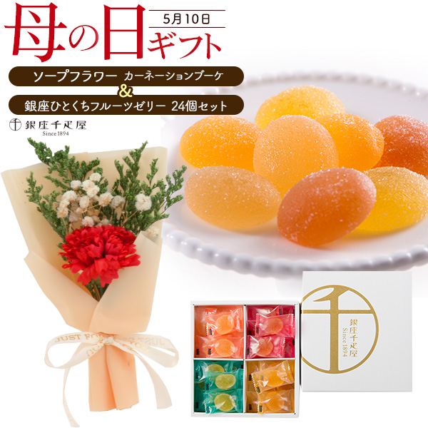 母の日ギフト 銀座千疋屋 銀座ひとくちフルーツゼリー & ソープフラワー 石鹸のお花とスイーツセット お菓子 洋菓子 造花 カーネーション ドライフラワー お花 造花 常温 母の日の贈り物 母親 お母さん ママ 義母 感謝 人気 花とセットプレゼント 予約 早割 送料無料