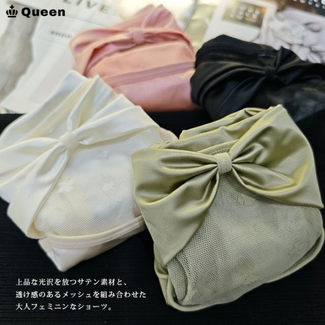 サテンレーススート柄メッシュオープンバックショーツ リボンモチーフサテンスート柄メッシュショーツ リボンつきカットアウトサテンスート柄メッシュショーツ フリルレース配色サテンスート柄メッシュショーツ |