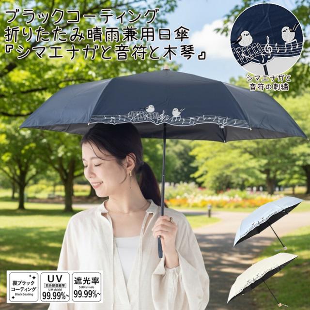 折傘 裏ブラックコーティング 晴雨兼用 日傘 雨傘 シマエナガと音符と木琴 刺繍 50cm 遮光率99.99% 遮熱 UVカット率99.99% 折り畳み傘 耐風 楽mini コンパクト グラスファイバー骨 傘 カサ 折り おしゃれ かわいい カジュアル 可愛い 人気 オールウェザー