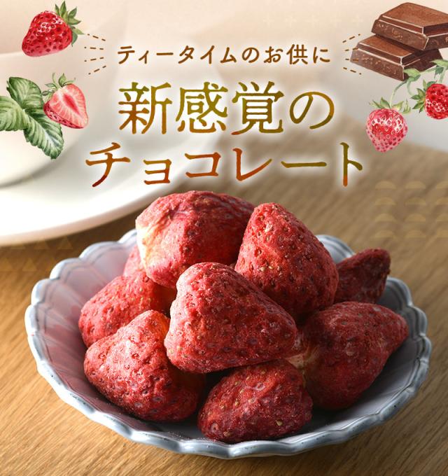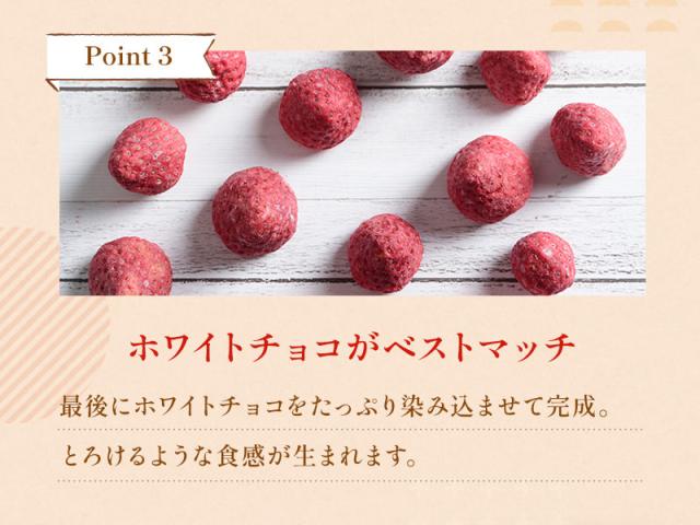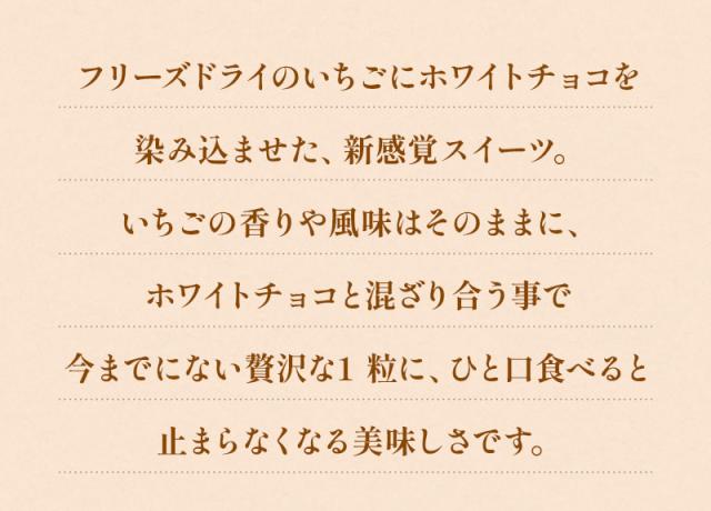 フリーズドライのいちごに、ホワイトチョコを染み込ませました。とろけるような食感でひと口食べると止まらなくなる美味しさです。