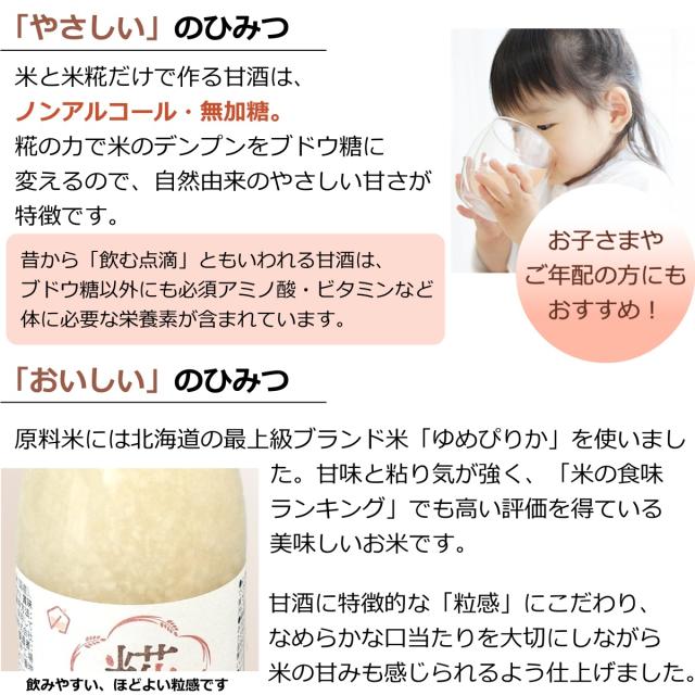 「だし醤油」でおなじみの鎌田醤油の甘酒です。北海道の最高級ブランド米「ゆめぴりか」と国産米の糀のみで作った、素朴ですっきりした味わいです。1本あたり180mlの、おすそ分けや少人数で飲みたい方にちょうど良いお試しサイズです。 // 砂糖不使用 ノンアルコール ストレートタイプ 米麹 甘酒 飲み切り 常温保存 長期保存 無加糖 そのまま飲める お中元 母の日 父の日 敬老の日 お歳暮 御年賀 ギフト プレゼント 健康 贈答 進物 土産 まとめ買い ケース販売
