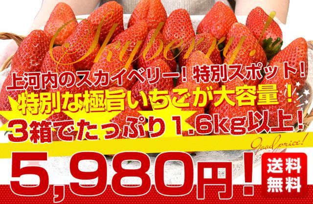 栃木県産 JAうつのみや 超盛り「上河内のスカイベリー」 たっぷり3箱 合計1.6キロ以上(約280g×6入り)計30粒から48粒 送料無料 すかいべりー いちご 苺 イチゴ【発送時期:カート内に記載しております】