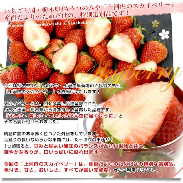 「上河内のスカイベリー」。産直だよりのための特別選別品を、たっぷりとお届けします!色付きが良く、赤い艶のある外観。果肉は舌触りがいい、なめらかな食感。甘みと程よい酸味のバランスの良い果汁が、たっぷりと果実の中に詰まっています。愛情と手間を