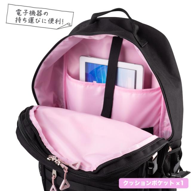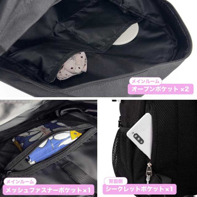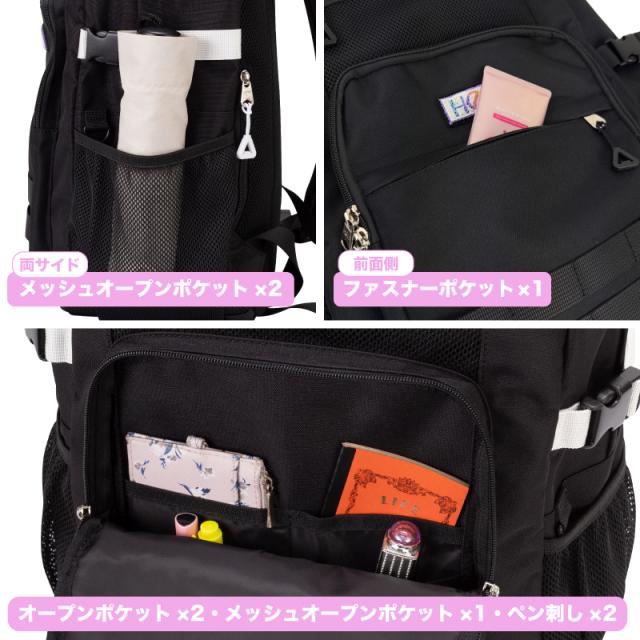 | ポケット | (外側)メッシュファスナーポケット×1、ファスナーポケット×2(その内1つ、オープンポケット×2、メッシュオープンポケット×1、ペン刺し×2)、メッシュオープンポケット×2、シークレットポケット×1 (内側)クッションポケット×1、メッシュファスナーポケット×1、オープンポケット×2 |