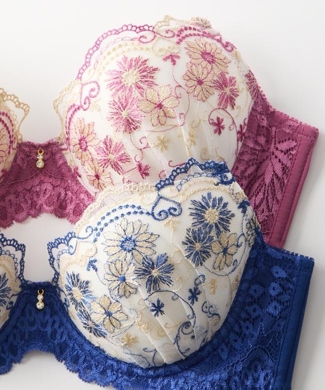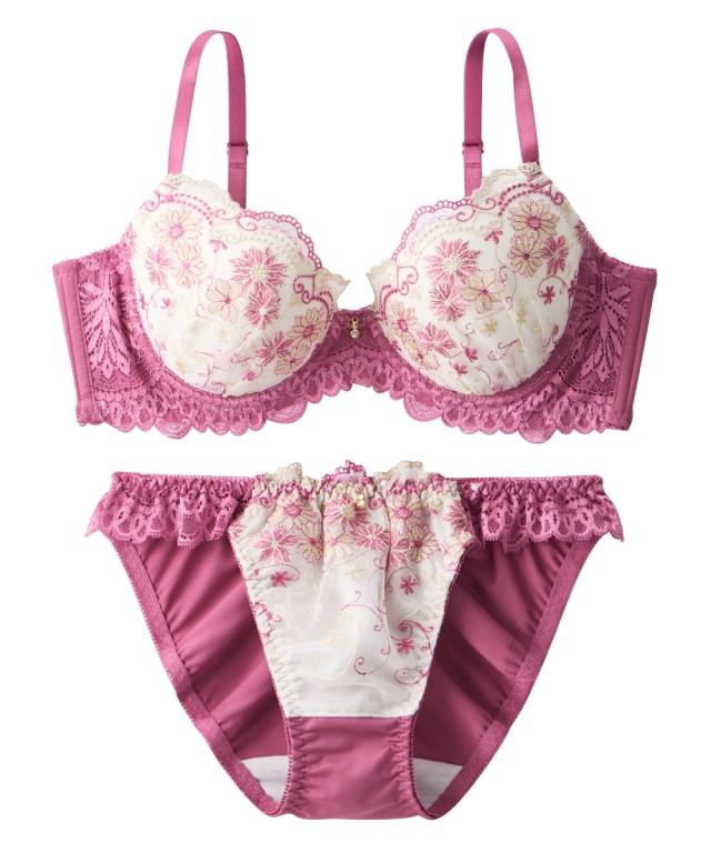 ラメをあしらったマーガレット刺繍が華やかなブラセット。 脇高仕様&U字バックで気になる脇肉もすっきり。 脇レースデザインのショーツで可愛らしさをプラス。 下厚モールドカップで美しいバストラインへ。 詳しいショーツサイズについては詳細画像内サイズ表を参考にお持ちのショーツと比較してみてください。