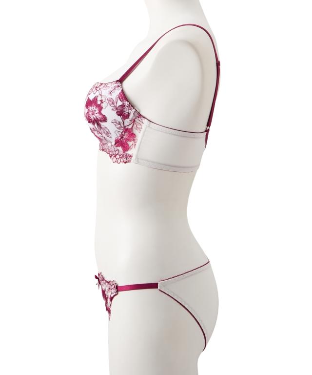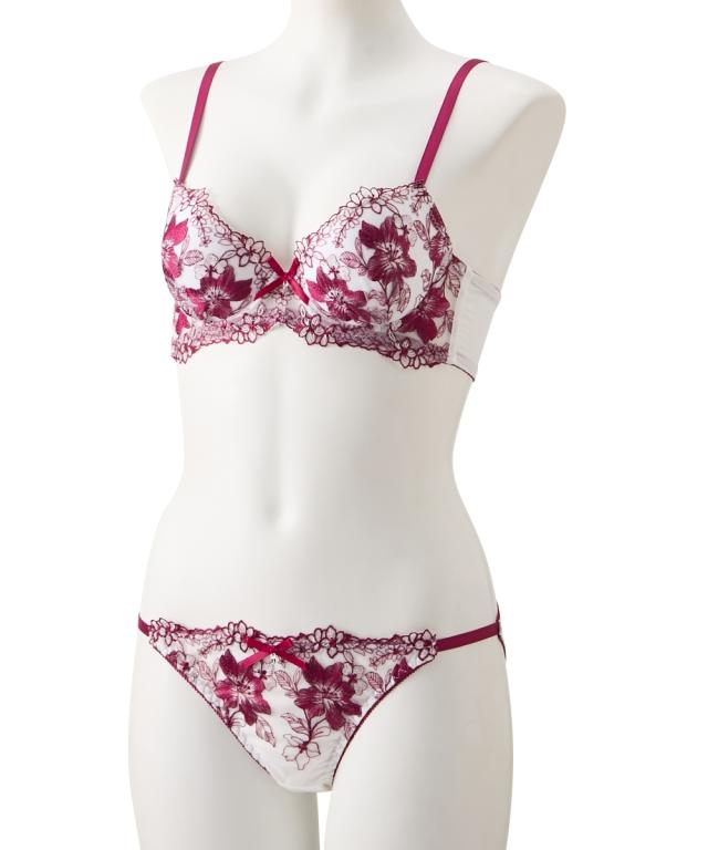 フェミニンブラ&ショーツが登場! 白ベースにビビットカラーのフラワー刺繍が目を惹くデザイン! 胸元とショーツのリボン&チャームで豪華な印象へ 脇高設計で背中からしっかり寄せこみ、美谷間&美シルエット!