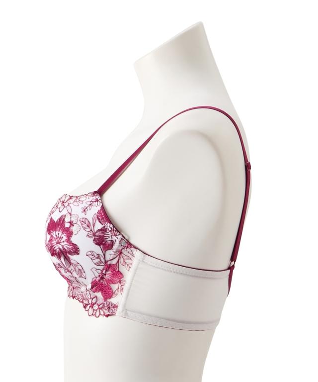 フェミニンブラ&ショーツが登場! 白ベースにビビットカラーのフラワー刺繍が目を惹くデザイン! 胸元とショーツのリボン&チャームで豪華な印象へ 脇高設計で背中からしっかり寄せこみ、美谷間&美シルエット!