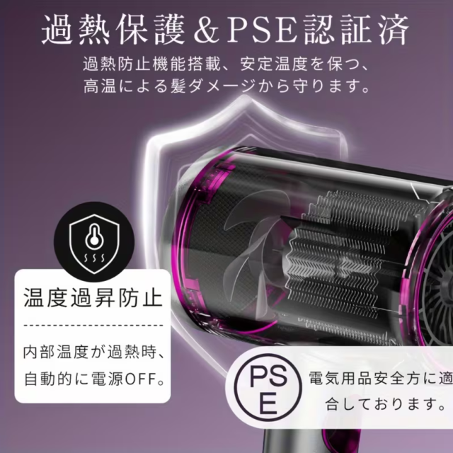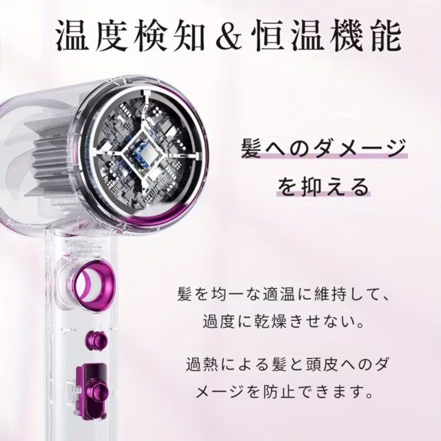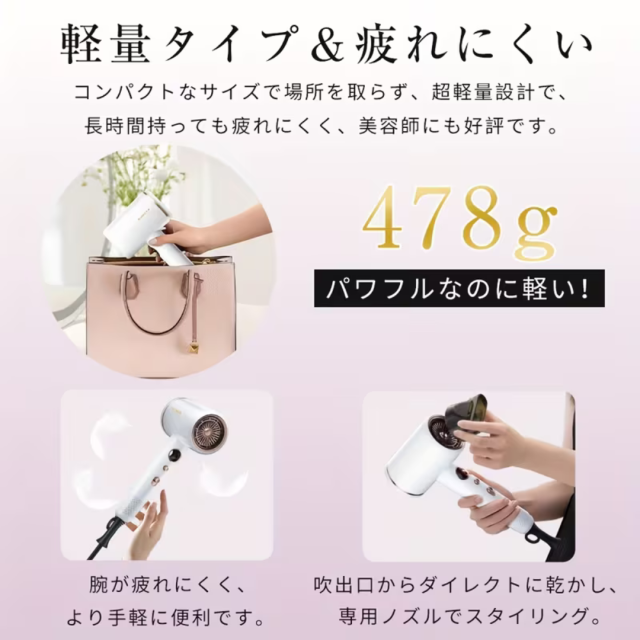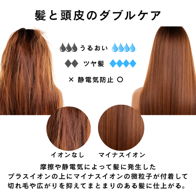 ・特徴:マイナスイオンで髪のダメージを軽減。