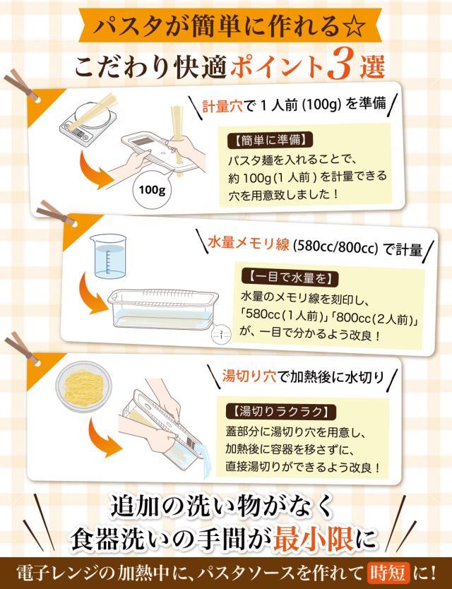 【雑誌掲載モデル】 電子レンジ パスタ容器 茹でる パスタ調理 レンジパスタ容器 レンジ パスタ調理器 パスタ調理道具 タッパー パスタ皿 一人暮らし 調理 容器 パスタ 麺 水切り 1人前 2人前