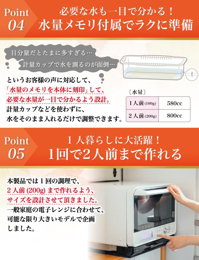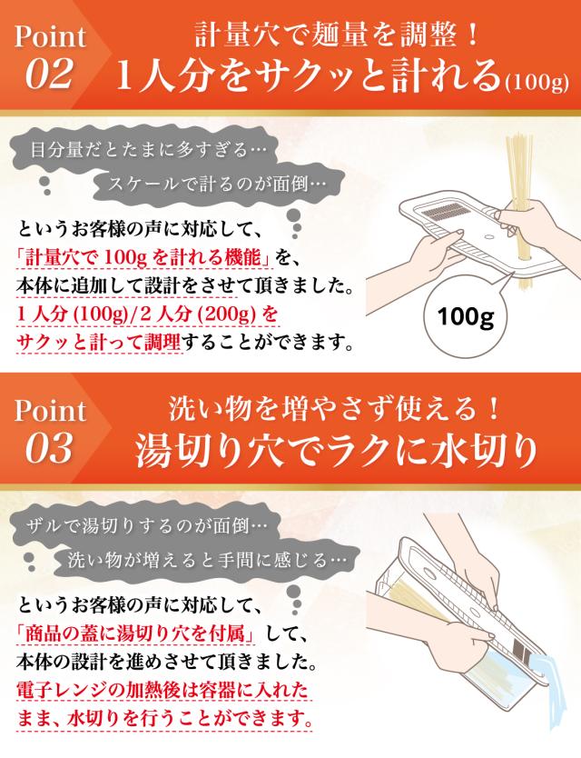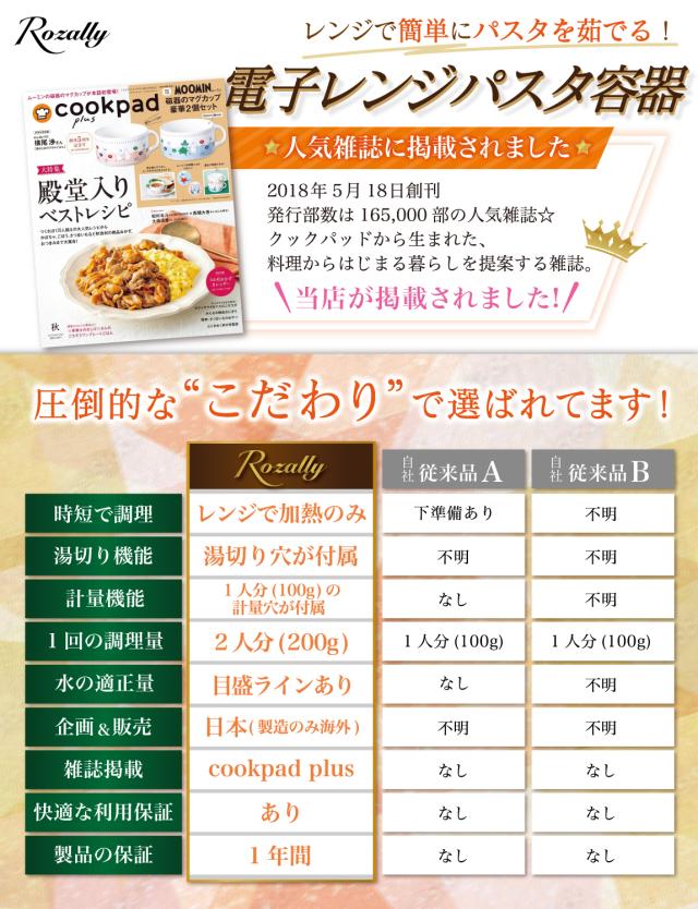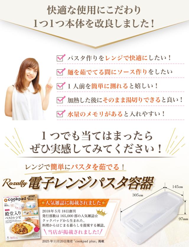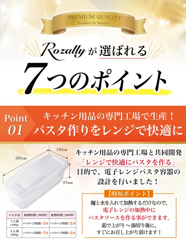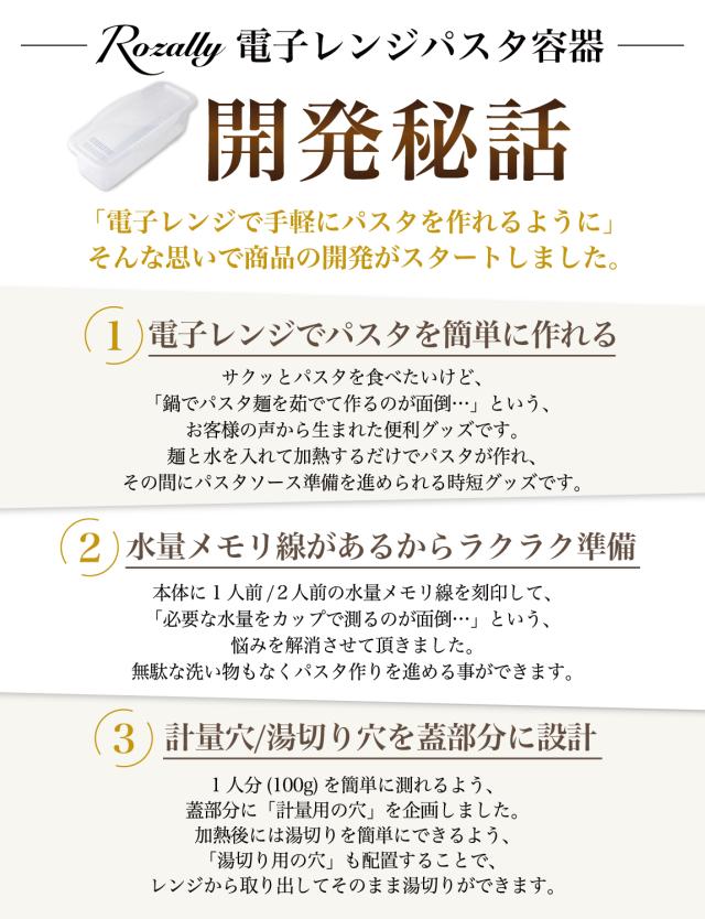 様々なメーカーからレンジ調理器具として ” パスタ容器 ”や” パスタ調理皿 ”など 日本製/中国製など様々に販売されていますが、 Rozallyの 電子レンジパスタ容器 は”こだわり”が一味違います。 「蓋に湯切り穴」を作ることで洗い物を最小限に抑えることと、 「蓋の計量穴で1人前(100g)」を簡単に計れるこだわり設計です。 |