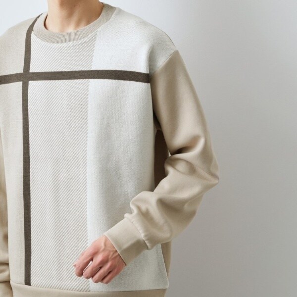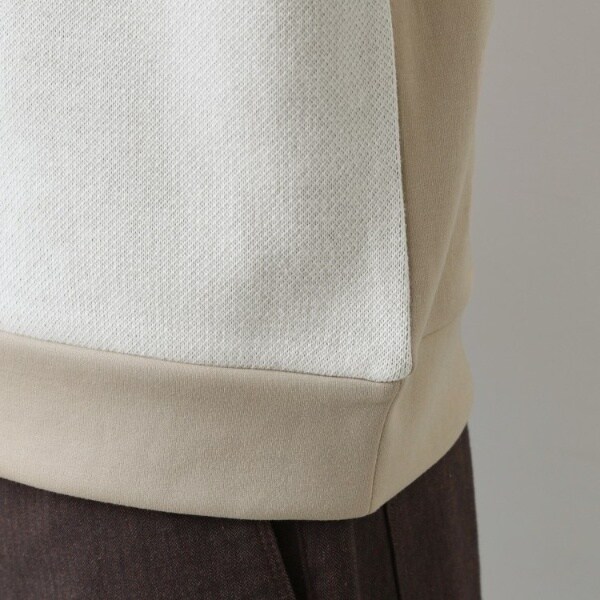 ニットの表情感とカットソーの軽快さをバランスよく融合し、1枚で着映えするアイテムに仕上げています。