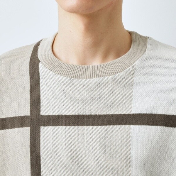 前身頃にチェック柄ニットを使用し、袖と後ろ身頃にはダンボール素材のカットソーを組み合わせた異素材切替デザイン。