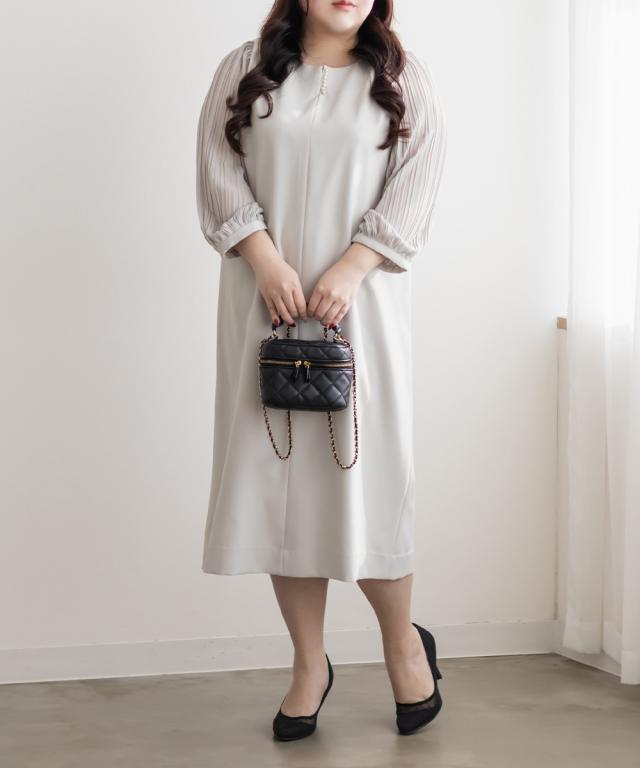 | 3Lサイズを着用しました。身幅やウエストまわりに程よくゆとりがあり、全体的にちょうどいい着心地でした。ストンとしたシルエットなのでサイズ確認をお勧めします◎袖のプリーツシフォンが上品で華やかな印象に見せてくれます。気になる二の腕もさりげなくカバーしてくれるのが嬉しいポイント♪ 身頃はすっきりとしたシルエットで、体のラインを拾いすぎず安心感があります。きれいめなデザインなので、アクセサリーや小物を合わせればハレの日やお呼ばれシーンにもおすすめです◎ 普段のお出かけから特別な日まで、幅広く活躍してくれそうなワンピースだと思いました。 |