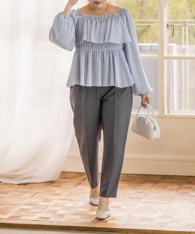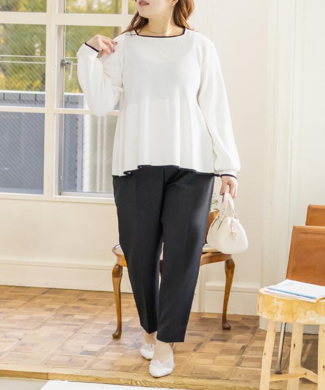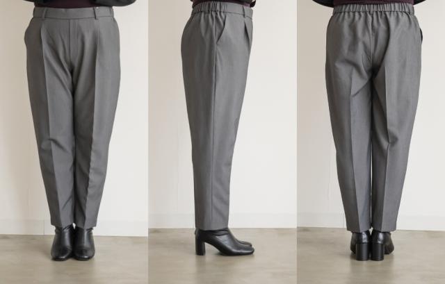 | 3Lサイズを着用してぴったりのサイズ感でした。足元に向かってすっきり細くなるシルエットで美脚効果のある1本です。後ろウエストゴム仕様で窮屈感のない着心地で、さらりとした程よくしっかりとした生地なのでオールシーズン着まわせます◎普段使いはもちろん、お仕事や綺麗目な服装が必要なシーンでも活躍しそうです! |
