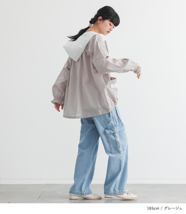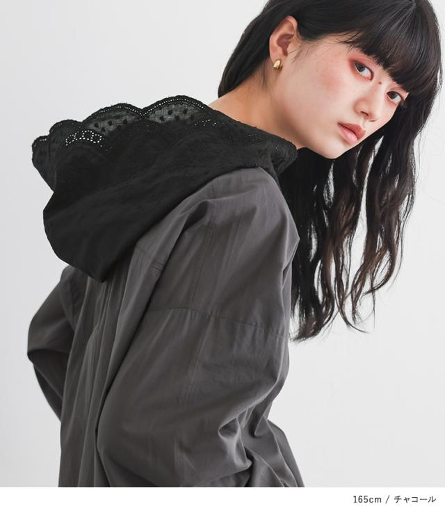 ■デザイン 華やかなレース生地をフードに使用した甘めの羽織り。裾は絞れる紐付きデザインと袖口ゴム入りでお好みのシルエットで着られます。透け感のある生地でさっと羽織りやすい優秀アイテム。 ■コーディネート ゆるっとしたシルエットでワンピースやボトムス問わず合わせていただけます。デニムに合わせてカジュアルに甘さをプラスするスタイリングもおすすめです。シンプルなスタイルにさっと羽織るだけで女性らしさ漂うスタイルが完成します。 ■素材 柔らかい肌触りのコットン100%生地を使用。身頃には薄手のブロード生地とフードには華やかなレース生地をドッキング。薄手なので春、秋にぴったりな生地感です。 |