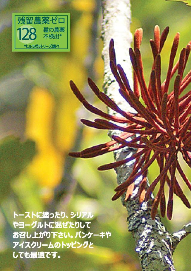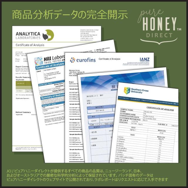 ◆残留農薬不検出 モソップはちみつは、全バッチで除草剤グリホサートに加え、5種類のネオニコチノイド系殺虫剤を含む、計128種の農薬検査に合格しています。