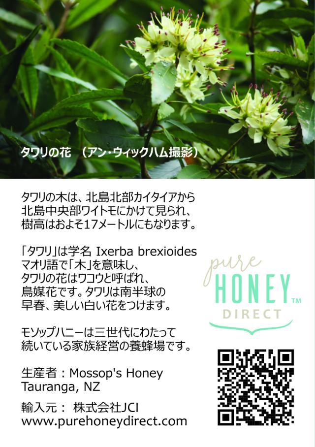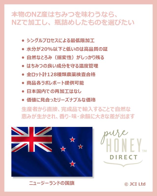 ◆フィールド&タワリはちみつは、淡い琥珀色で、穏やかな甘みです。クローバーをはじめとしたさまざまな野(フィールド)の花の蜜と、ニュージーランドの固有種、タワリの花蜜をミックスしているため、「フィールド&タワリ」と名付けられました。