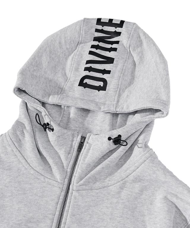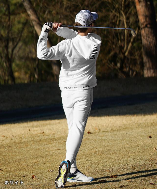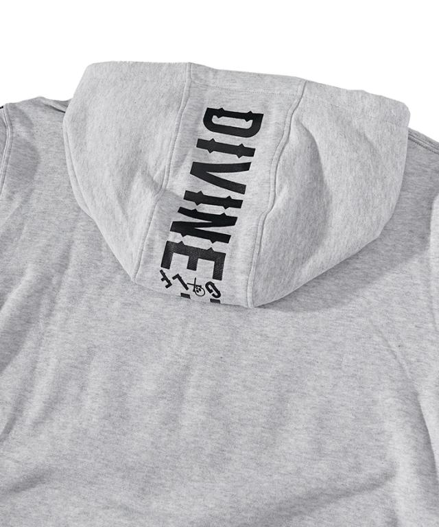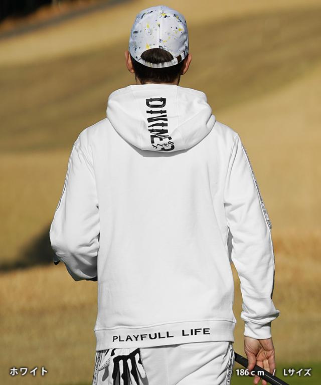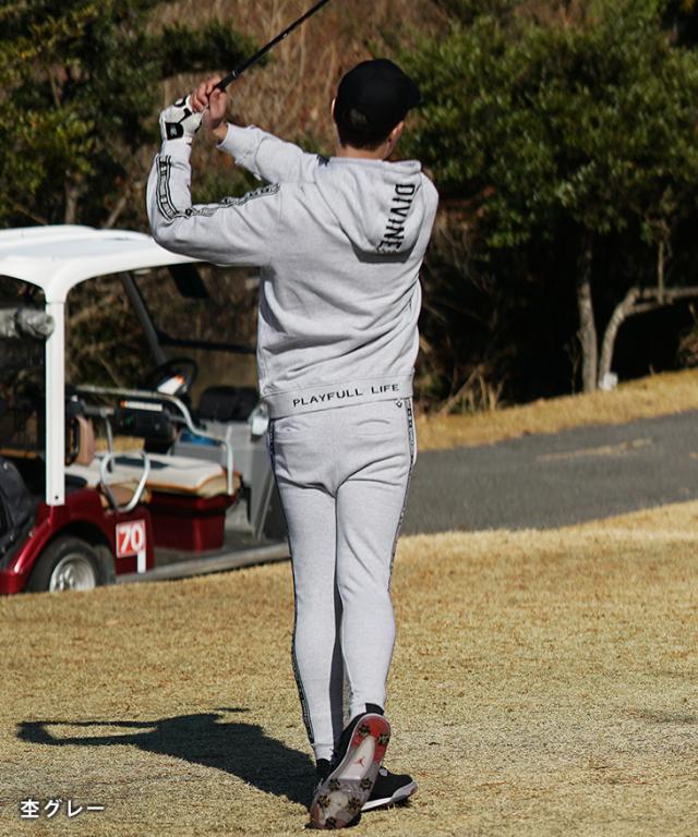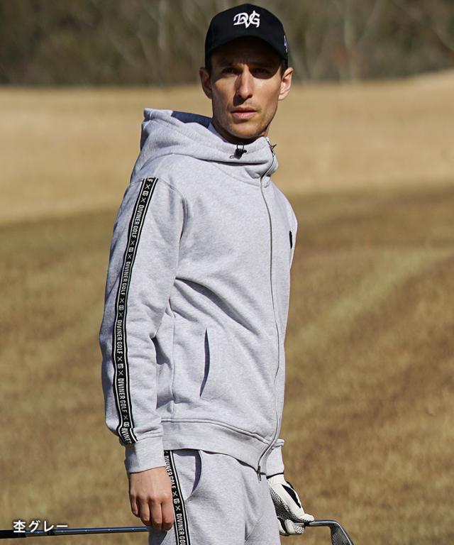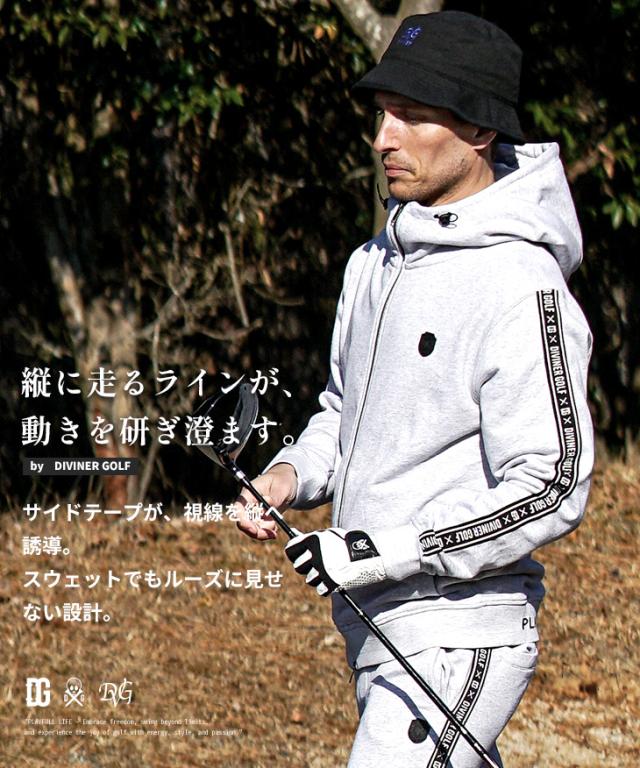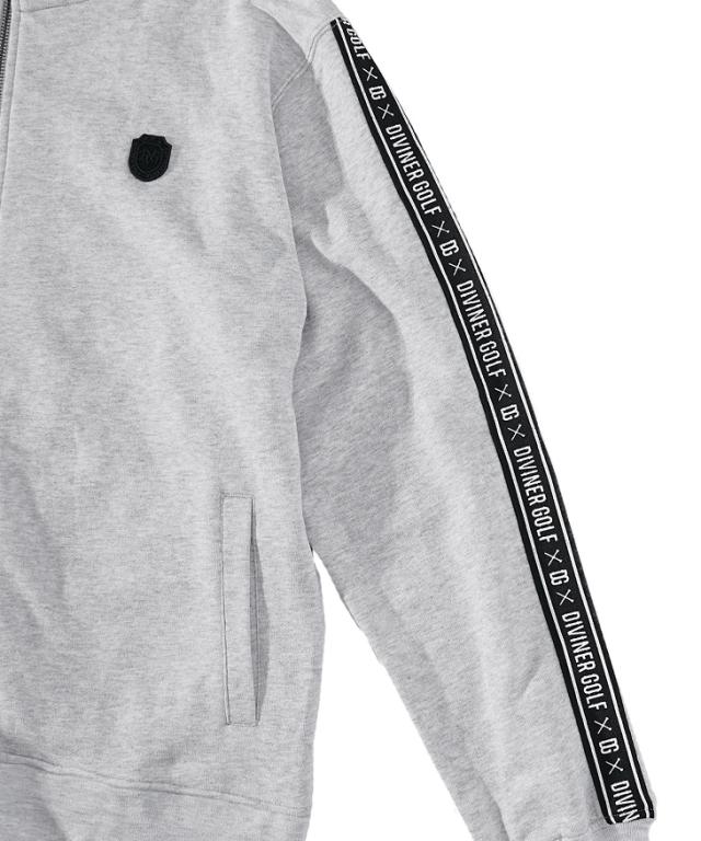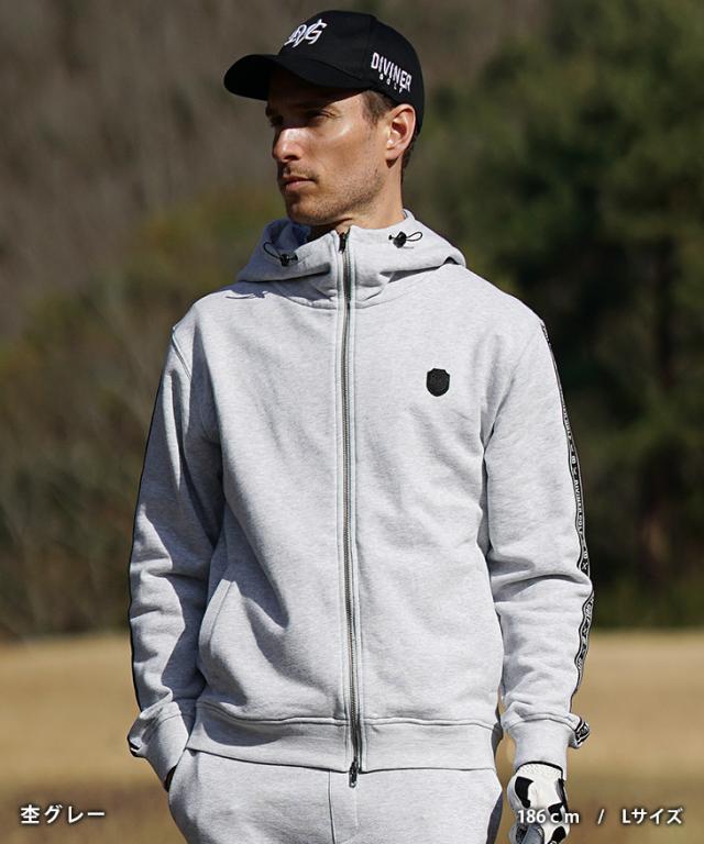 DIVINER GOLF(ディバイナーゴルフ)『裏毛テープロゴパーカー』【裏毛テープロゴパーカー】■Design/デザイン柔らかな綿素材の生地にサイドラインテープを走らせたスウェットロゴパーカー。左胸元のロゴエンブレムだけでなく、フード部分には縦にロゴを走らせ、バック部分のリブにもジャガードでデザインを。抜け目なく、派手すぎない存在感を発揮。ダブルジップ仕様で、お腹周りのだぶつきも解消でき、スウェットでもクリーンな佇まいでプレー可能に。■Material/素材感程よい肉感のある綿100%の生地を使用。裏毛素材で馴染みのよい素材感なので肌あたりが優しく、長時間着てもストレスを感じにくい上質な着心地を楽しめます。