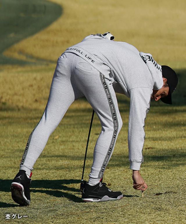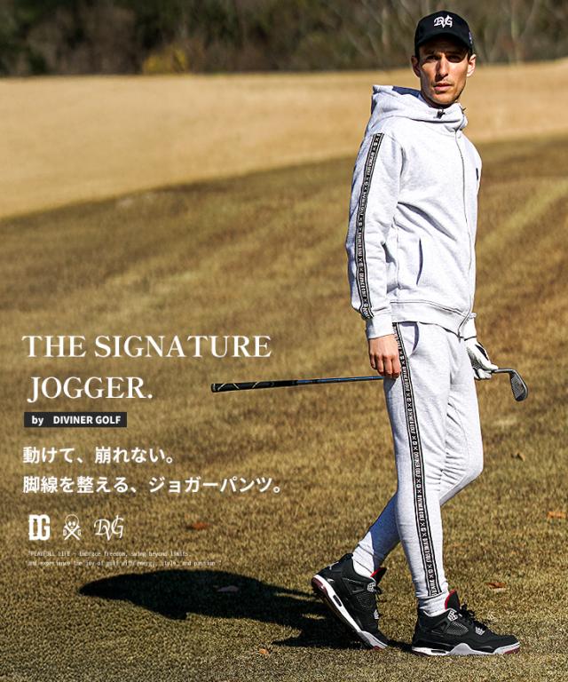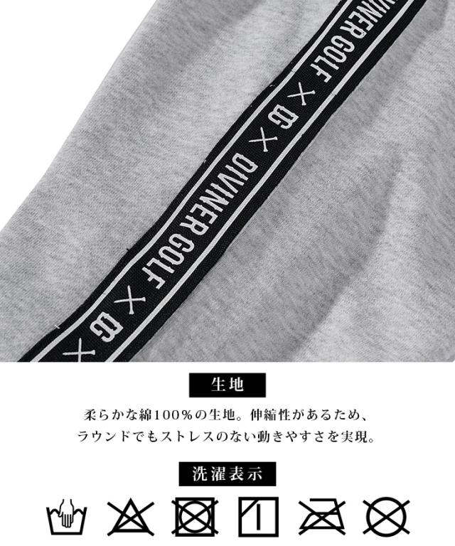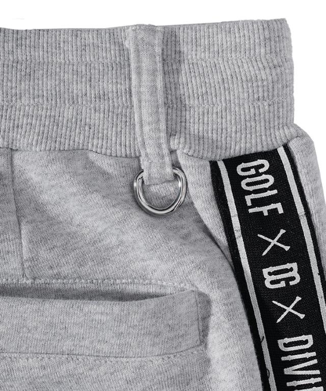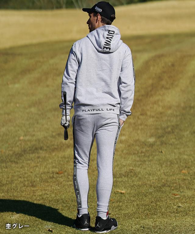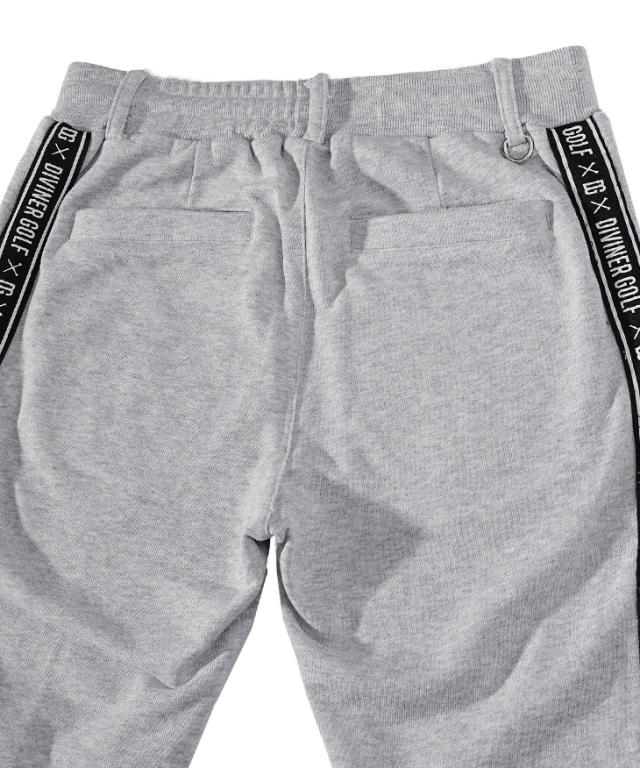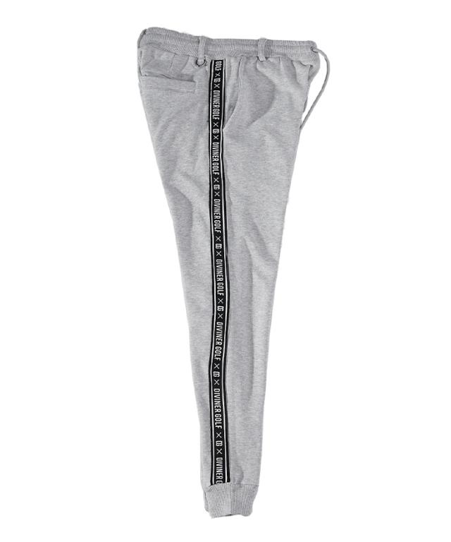 DIVINER GOLF(ディバイナーゴルフ)『裏毛テープロゴジョガー』【裏毛テープロゴジョガーパンツ】■Design/デザイン柔らかな綿素材の生地にサイドラインテープを走らせたスウェットジョガーパンツ。左ポケット付近のロゴエンブレムと、オリジナルロゴのサイドライン。無駄をそぎ落としながら、無地ではないデザイン性を発揮する一本。ウエストゴム仕様ながらベルトループ付きで汎用性の高さも持たせており、リブを細目に仕上げ、メリハリの効いたスタイリッシュな佇まいを実現。■Material/素材感程よい肉感のある綿100%の生地を使用。裏毛素材で馴染みのよい素材感なので肌あたりが優しく、長時間着てもストレスを感じにくい上質な着心地を楽しめます。
