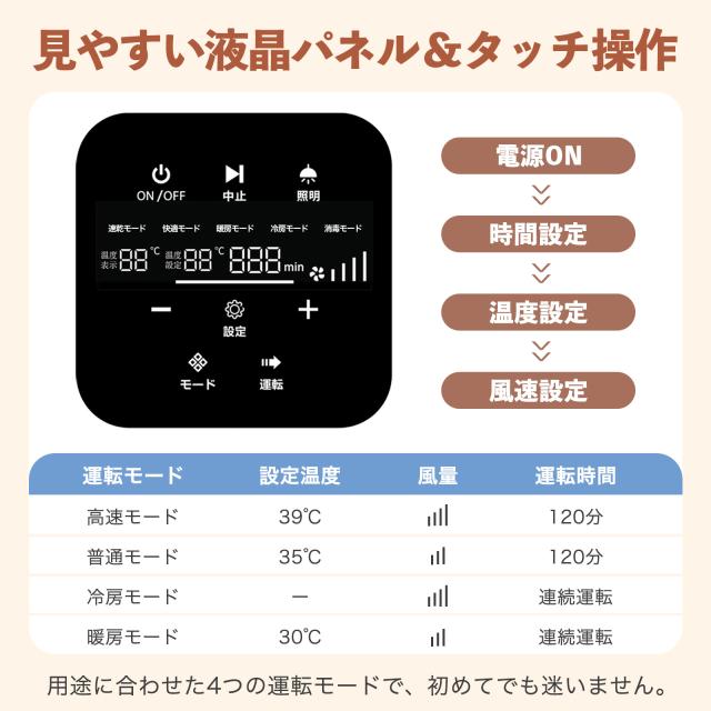 時間・温度・風量は自由調節可能。4つの運転モード搭載で簡単操作。