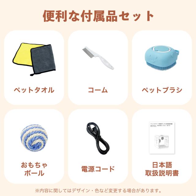 付属品:ペットタオル、コーム、ペットブラシ、おもちゃボール、電源コード、取扱説明書