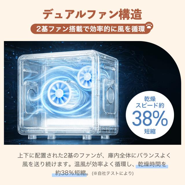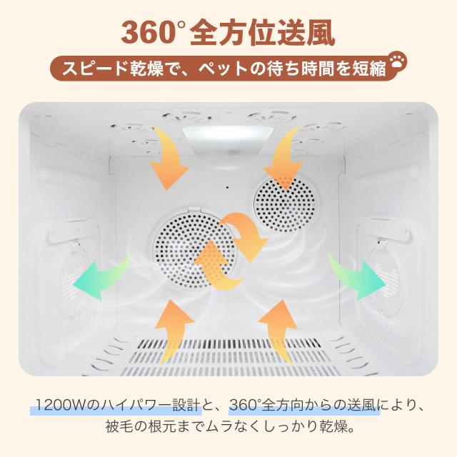 上下2基のデュアルファンによる360°全方位送風で被毛の根元までしっかり乾燥。