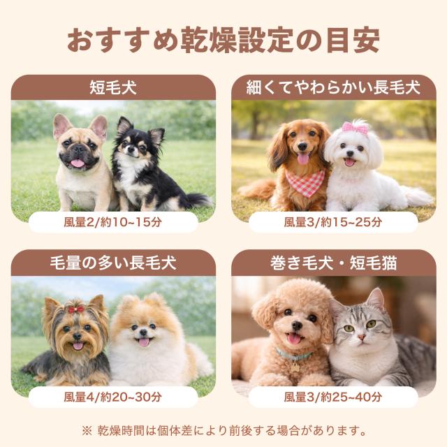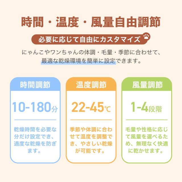 ペットの毛並みや季節に合わせて時間・温度・風量の設定が可能です!